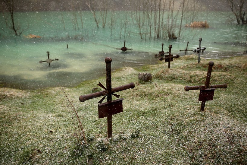 Больше всего оставшихся местных жителей беспокоит и печалит то, что власти не выполнили обещание и не перенесли могилы предков в другое место. И вот сейчас кладбище практически полностью погребено под непонятного цвета жижей. Кресты, которые виднеются из водоема на фото, находятся на холме и затоплены совсем недавно. Но на глубине озера есть другие могилы, которые уже не восстановить.