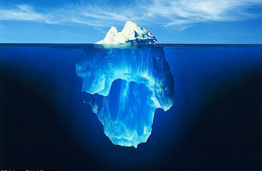 Айсберги могут быть необычайно огромными. На поверхности воды видно лишь около 10 процентов от их настоящего объема. Большая же часть скрывается под водой.