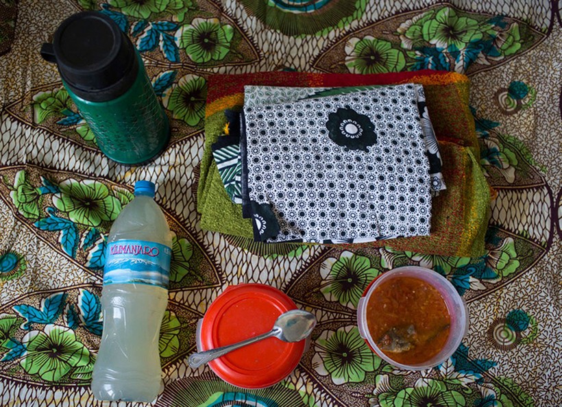 Зайтуни (Киомбои, Танзания): термос, еда, вода, одежда для мамы. У ее дочки пока нет одежды, она заворачивает ее в куски ткани, которые стирает по мере загрязнения