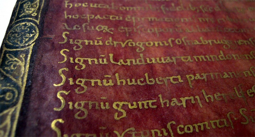 На этом пурпурном, тисненном золотом пергаменте описываются дары Оттона I церкви, 950 год.