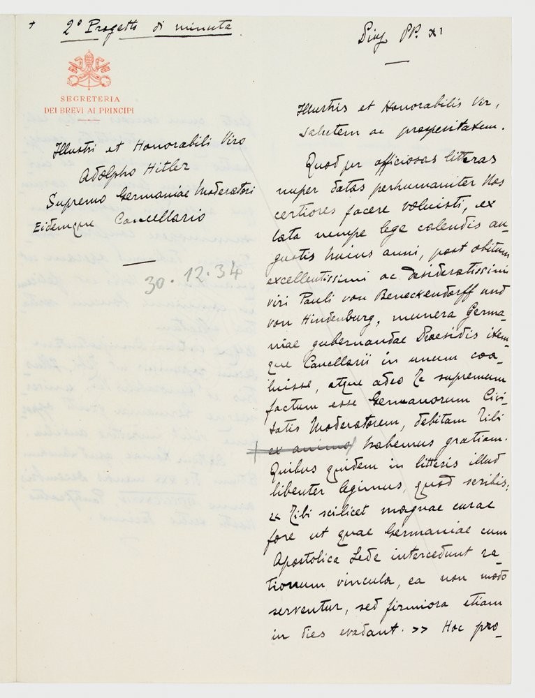 Письмо папы Пия XI 1934 года, в котором он отвечает Адольфу Гитлеру на намерение рейхсканцлера Германии укрепить связи с Ватиканом.
