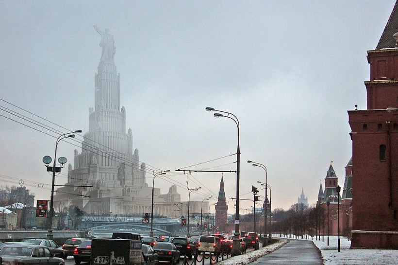 Вот так Дворец должен был бы выглядеть в современной Москве, будь он построен.