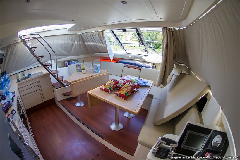 4. Главное отличие от привычных мне интерьеров и внутреннего устройства парусных яхт — наличие пространства, благо компоновка подобных катеров это позволяет.