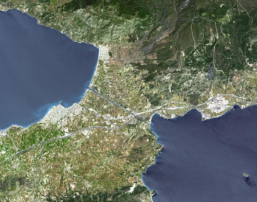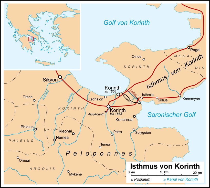 О том, чтобы соединить Саронический залив Эгейского моря и Коринфский залив в Ионическом море, мечтал не один правитель древнего мира. С помощью такого канала можно было бы сократить путь вокруг полуострова Пелопоннес на целых 400 километров. Канал начинал строить еще древнегреческий правитель Периандр в VII веке до нашей эры. Но, испугавшись того, что из-за разницы уровня Эгейского и Ионического морей, может случиться затопление, остановил грандиозную стройку.