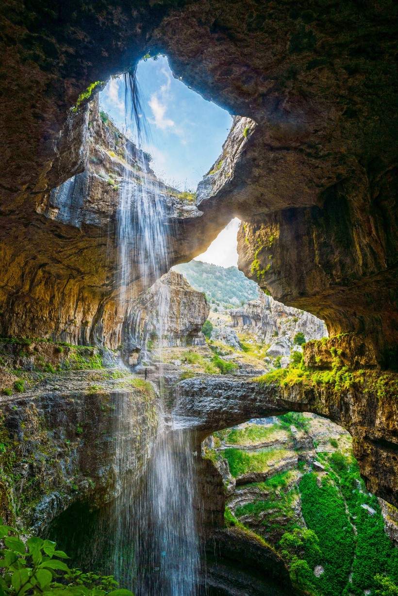 Пещера трех мостов в Ливане – фантастическое место, особенно после зимы, когда здесь собираются самые мощные потоки талой воды. Водопад ущелья Baatara или Глотка Баатары, достигает 250 метров и образовывался природным путем миллионы лет. Известняку, что у его подножья, 160 миллионов лет, то бишь, он застал еще юрский период, а ближайший населенный пункт - Мгхарет-аль-Гхауагир (Mgharet al-Ghaouaghir).
