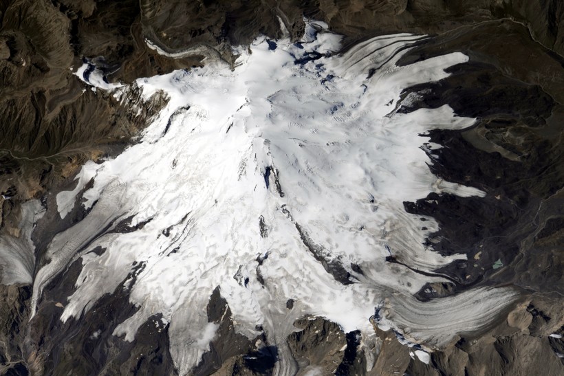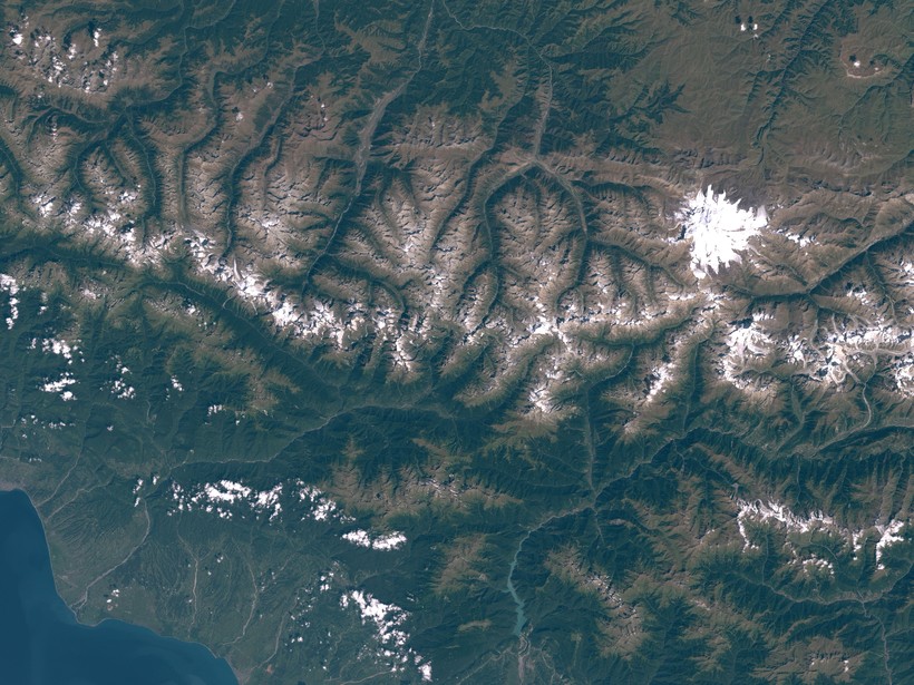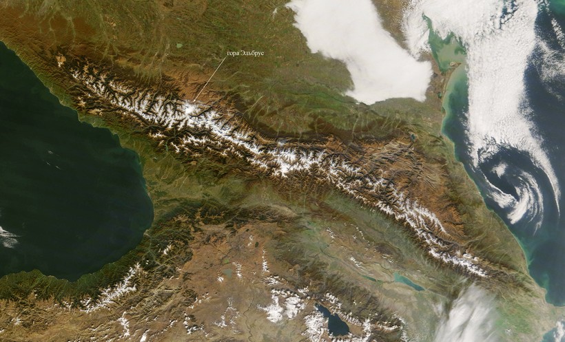 Так выглядит горная система Кавказа и величественный Эльбрус из космоса.
