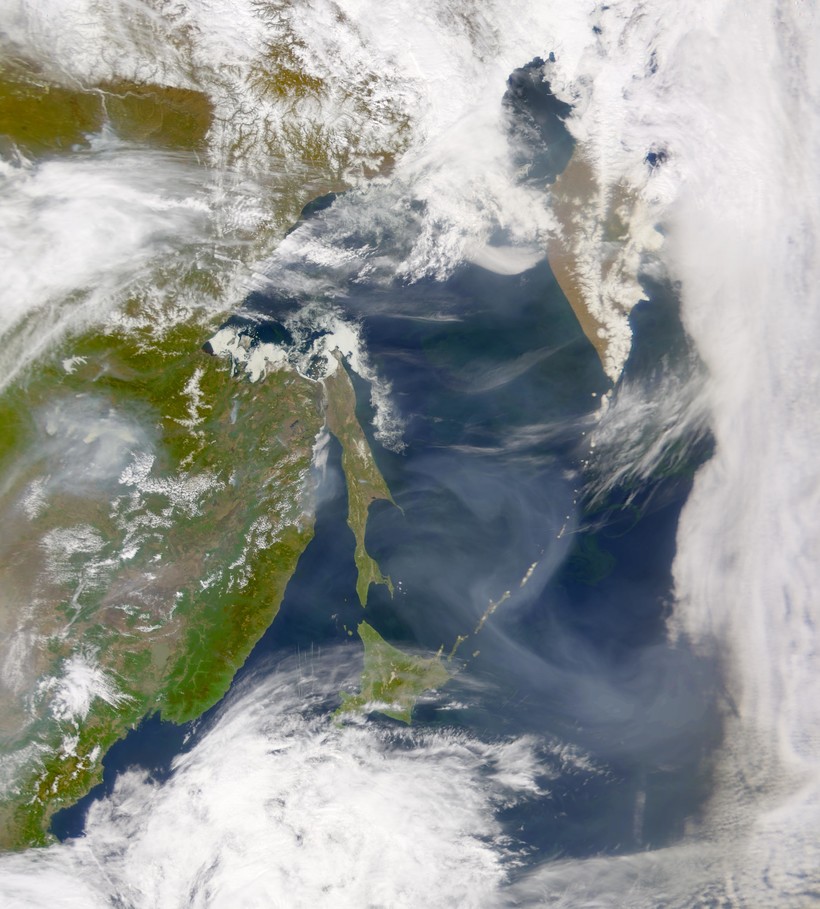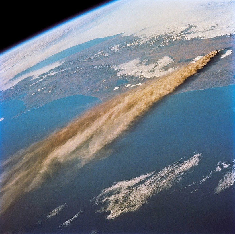 А на этом снимке со спутника виден грандиозный шлейф пепла и дыма, который тянется от Ключевской сопки над акваторией Тихого океана во время очередного извержения.
