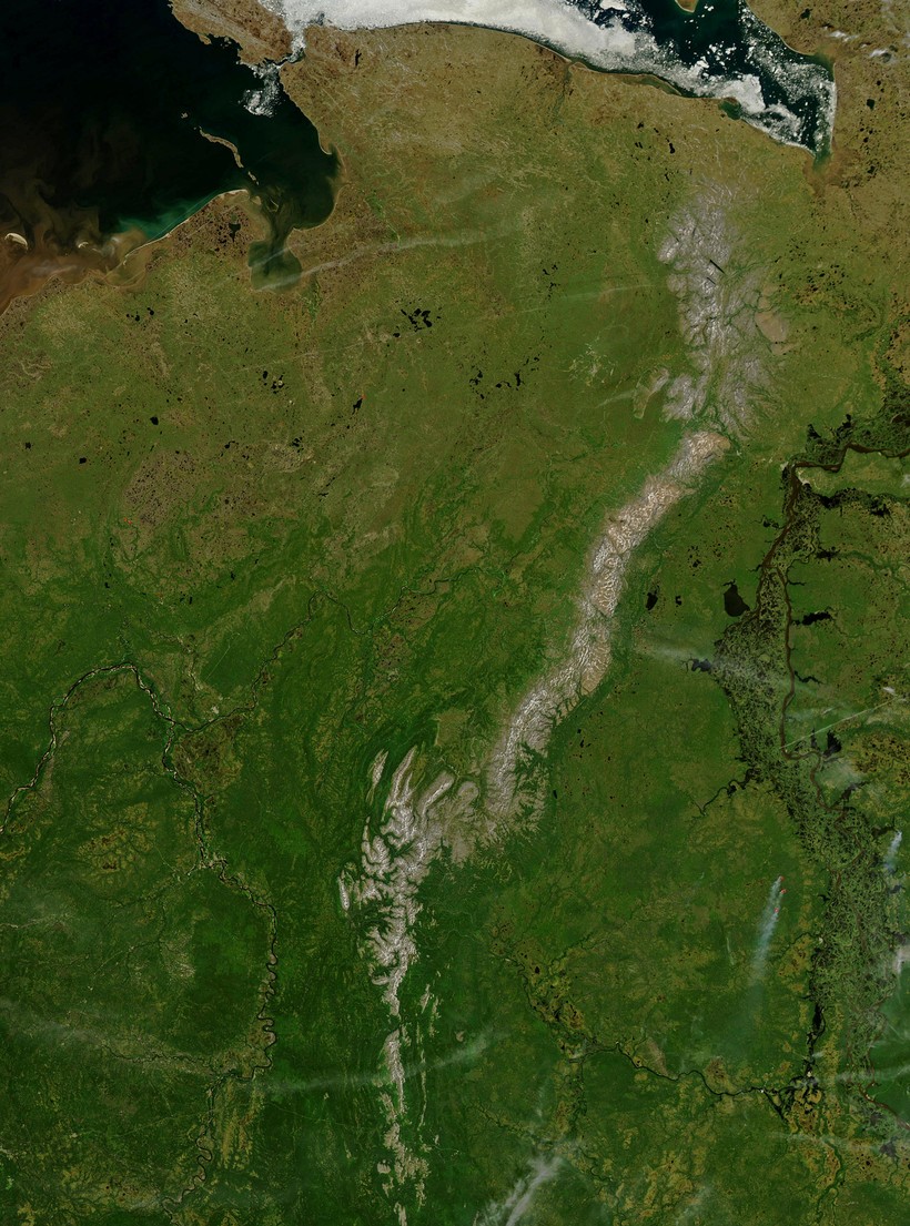 Уральские горы, отлично различимые из космоса, разделяют две обширные равнины: Западно-Сибирскую и Восточно-Европейскую. Они берут начало на побережье Баренцева моря и растворяются в жарких песках Казахстана.