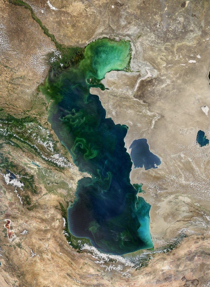 Морем Каспий назван за свои грандиозные размеры, хотя на самом деле это огромное бессточное озеро. На этом снимке, сделанном из космоса, Каспийское море во всем своем величии. Южная часть моря-озера более глубокая и имеет на снимке темный оттенок, северная, мелководная часть потрясающе красивого изумрудного цвета. В северо-западной части можно видеть обширную дельту реки Волги — крупнейшего притока Каспия.