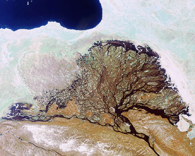 Это дельта реки Лены, которая впадает в холодное море Лаптевых.