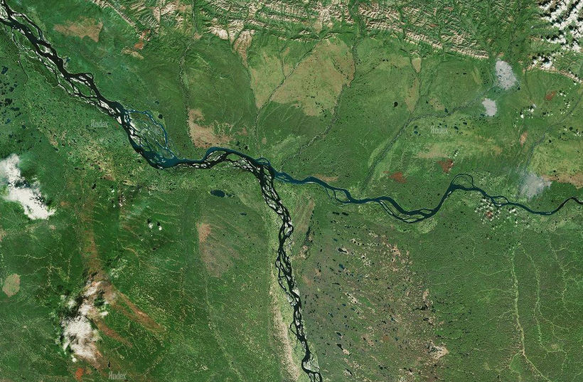 А так из космоса выглядит место слияния Лены (слева) и Алдана (справа), ее самого крупного притока.