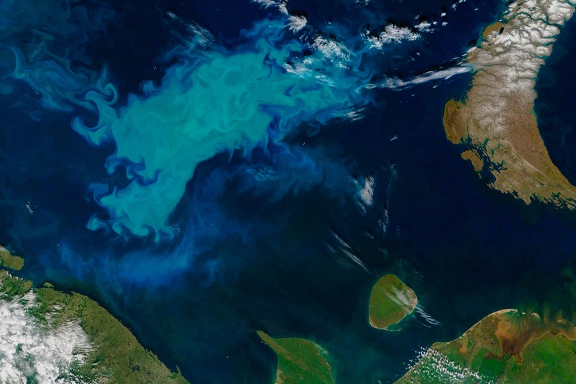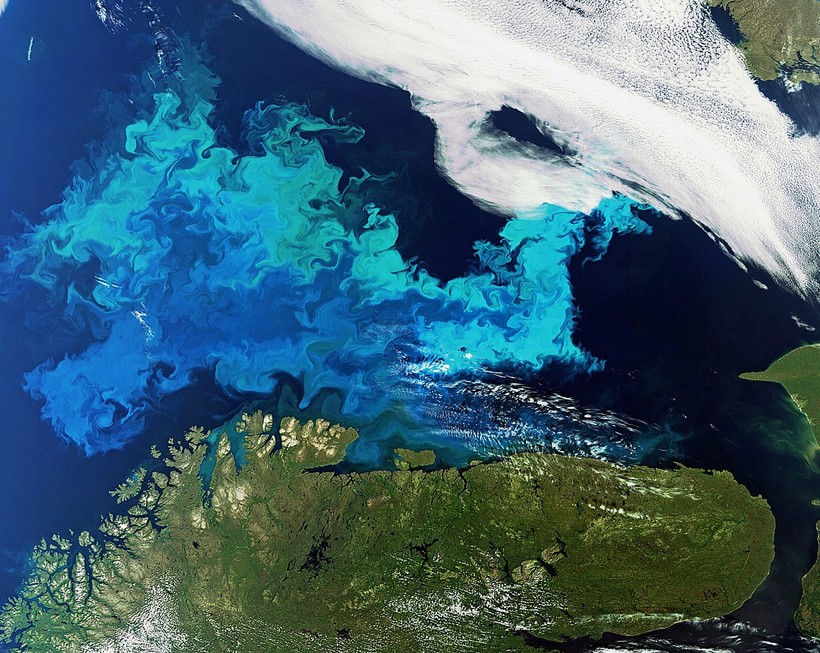 На этом космическом снимке, сделанном в августе 2011 года, видна южная часть Баренцева моря. В левом нижнем углу расположен Кольский полуостров, в верхнем правом углу снимка — остров Южный, архипелаг Новая Земля. Потрясающе красивый бирюзовый оттенок водам Баренцева моря придает фитопланктон.