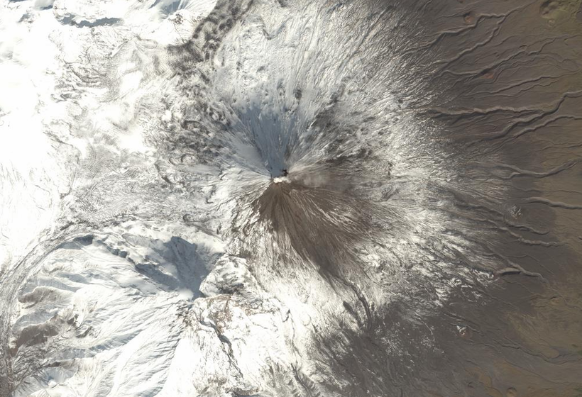 Ключевская сопка — весьма активный вулкан, расположенный на полуострове Камчатка. На этом космическом снимке виден белый дым, выходящий из кратера вулкана.