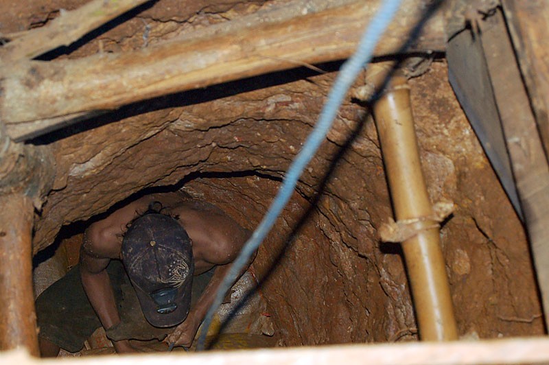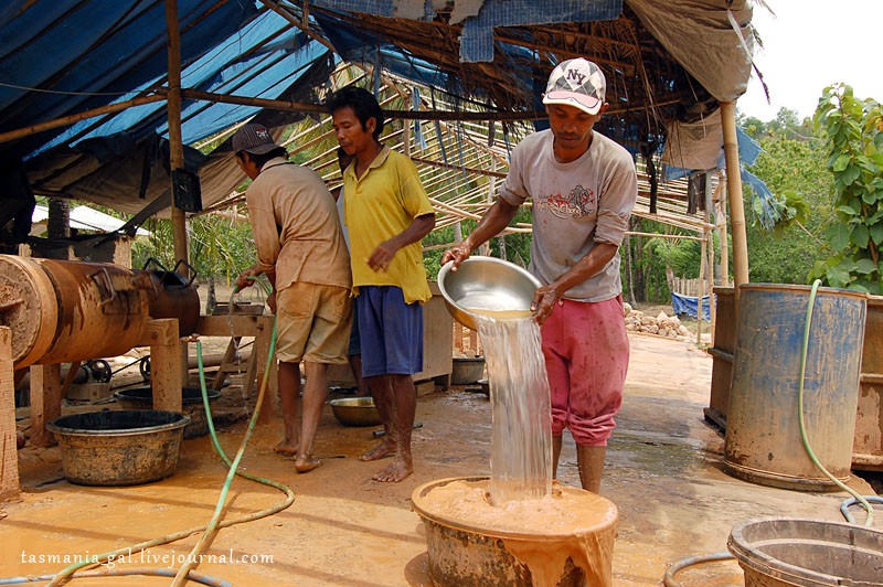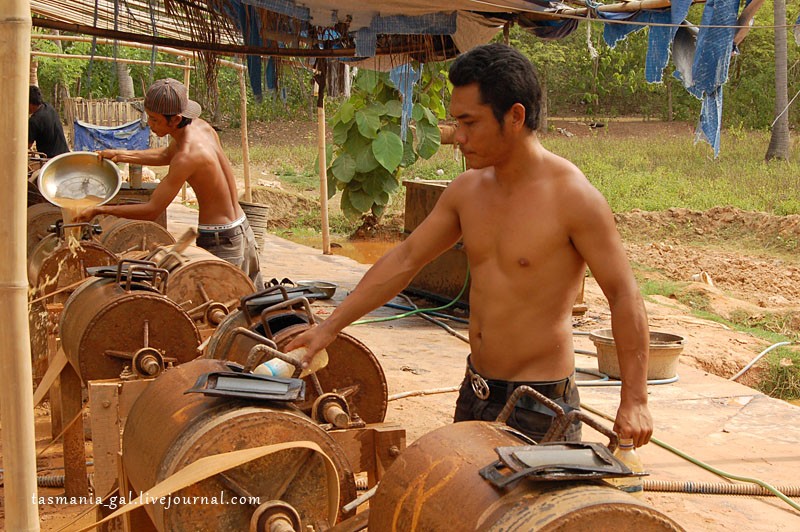 Золота на холмах мало. Его и в земле мало, чтобы под землей найти, надо шахты рыть в глубину метров по пятнадцать. И лезть в них. Для храбрости пьют самогон, по статистике каждый месяц восемь человек из-под земли не возвращаются. Поэтому собирают золото с поверхности, что тоже не кусками-самородками удачливых ждет, а разбросано золотыми жилами в камнях. Просто так с камнями не справиться, здесь особая технология нужна. На языке местных: «Налей ртути, получишь золото». Практически алхимия.