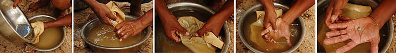 Далее месиво переливают в таз и начинают промывать водой из шланга.