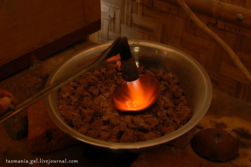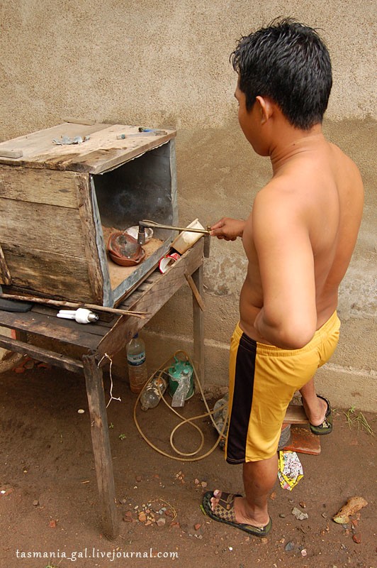 Заветный грязно-серый шарик — это еще не золото. Ртуть из амальгамы нужно выпарить, для этого нагреть на самодельной горелке, как у сварщиков. Делают это на открытом воздухе, на столе, огороженном с трех сторон бамбуковыми циновками или наспех сколоченными деревяшками.