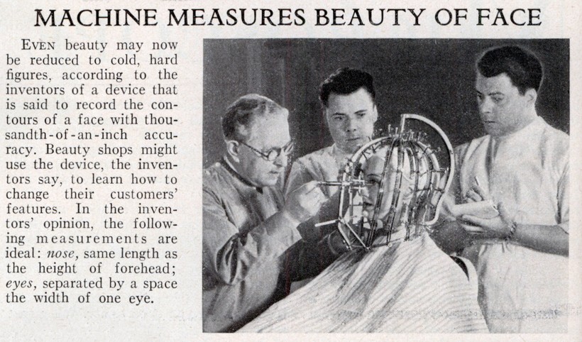 Специалист компании Макс Фактор был убежден, что красота поддается математическим расчетам, поэтому в 1933 году он придумал устройство, рассчитывающее параметры красоты женщины: размер головы и форму лица. Эти результаты помогали ему определить, где нужно наносить румяна, тени и помаду.