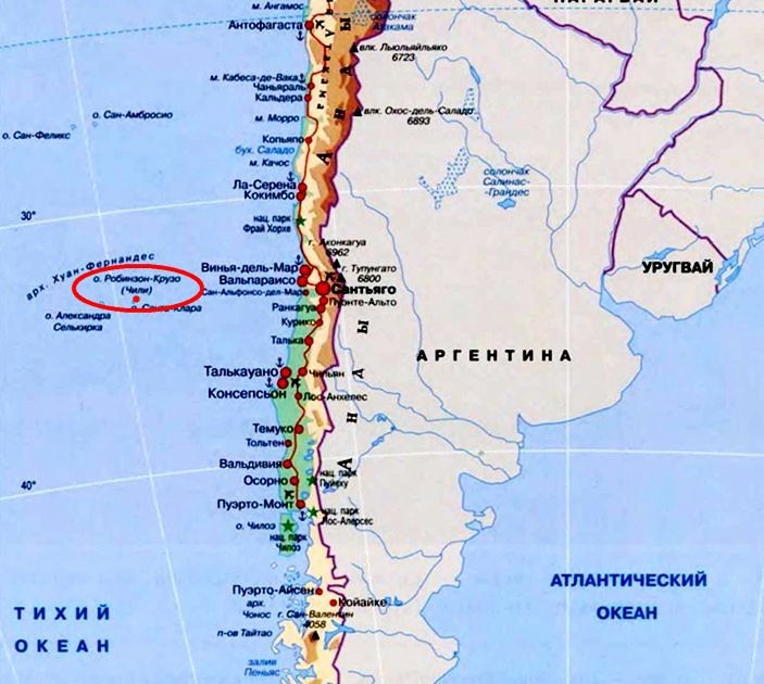 Остров Робинзон-Крузо расположен у западных берегов Южной Америки и принадлежит Чили. Расстояние до материка составляет более 600 километров. Он является одним из трех островов архипелага Хуан-Фернандес и имеет площадь 47,9 кв.км. Архипелаг имеет вулканическое происхождение и характерный горный рельеф. Климат здесь средиземноморский, то есть наблюдаются ярко выраженные сезоны года: умеренно теплая зима (когда температура опускается до +5 ºС) и жаркое лето.