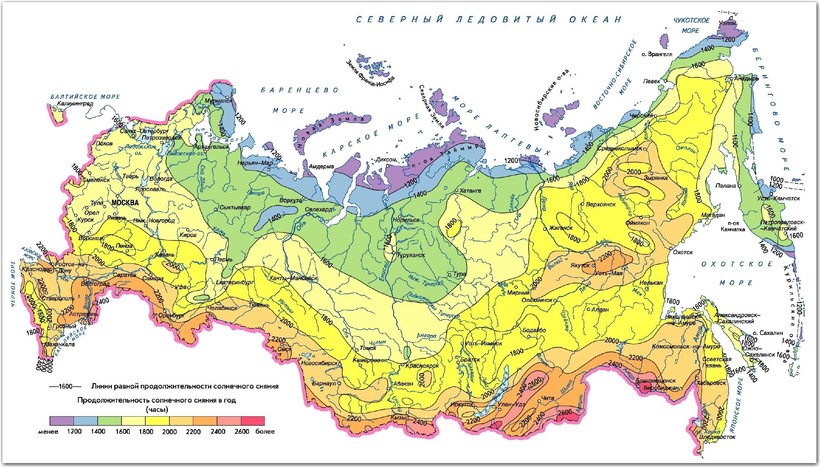Продолжительность солнечного сияния — это метеорологический показатель, который выражается в часах и представляет собой суммарное количество времени, когда в конкретной местности солнце находится над горизонтом и не закрыто облаками. Если взглянуть на карту России, то можно проследить изменение этого показателя по территории страны.