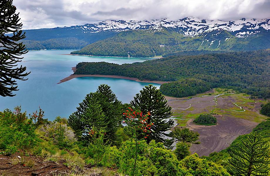 В первый же день мы отправились в трек по национальному парку Конгильио (Conguillio), который, кажется, запомнился всем как лучший из пройденных за поездку пеших маршрутов. Тропа, помеченная на картах как sendero Sierra Nevada, поднимается вверх по склону, то и дело открывая виды то на голубое озеро и зеленую долину, то на заснеженные вершины, то углубляясь в лесные заросли.
