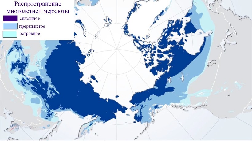 А теперь посмотрим на карту распространения многолетних мерзлых пород, которые сильно осложняют строительство дорог, зданий и промышленных объектов.