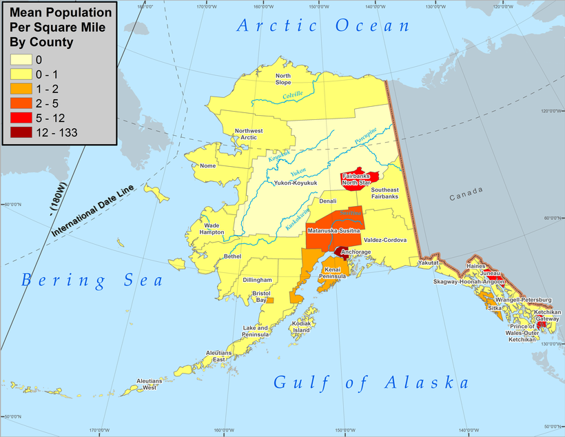 Для того, чтобы сравнение было объективным, можно взять Анкоридж и Петропавловск-Камчатский, который более близок к нему по климату, хотя и там немного холоднее, чем в Анкоридже. В Петропавловске-Камчатском проживают 180 000 человек. А вот Анадырь более правильно сравнивать с аналогичными по климату городами Аляски. Это, например, город Ном с населением 3 700 человек или Хупер-Бей, где проживают чуть более 1000 человек. Хотя там есть дороги и прочая инфраструктура, не многие хотят жить в этих городах: климат не тот, что в Анкоридже. Если же взглянуть на карту плотности населения Аляски, можно заметить, что большая часть населения сосредоточена на теплом Тихоокеанском побережье, что вполне логично.