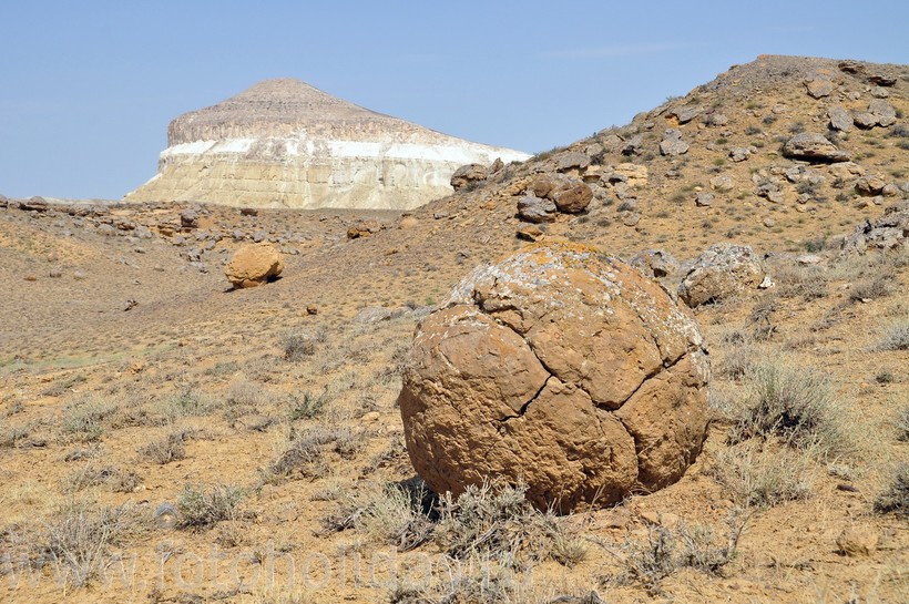 Эти каменные шары, расположенные на побережье Каспийского моря в жарких полупустынных районах Казахстана, не очень хорошо сохранились. Они покрыты трещинами или даже расколоты на несколько частей. Основной версией их происхождения является природная: так же, как и конкреции острова Чамп, они образовались в результате геологических процессов. На сколе некоторых шаров видно, что материал внутри располагается слоями, что свидетельствует о длительном времени отложения осадочных пород.