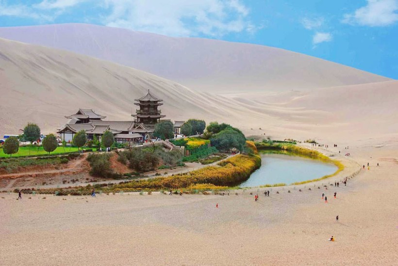 Этот оазис располагается на берегу озера Юэяцюань, что в переводе означает «молодой месяц». Названное так за свою форму, напоминающую полумесяц, это пресное озеро находится под особой охраной. Забор воды строго регламентирован, чтобы не допустить высыхания водоема. Ближайший населенный пункт — город Дуньхуан — расположен в 5 километрах от оазиса.