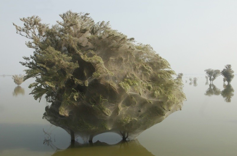 Такое явление можно было наблюдать в Пакистане после наводнения. Таким образом спасались пауки. Единственным их убежищем стали деревья.