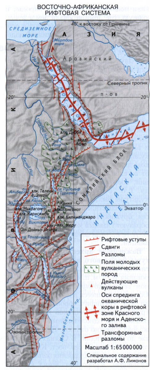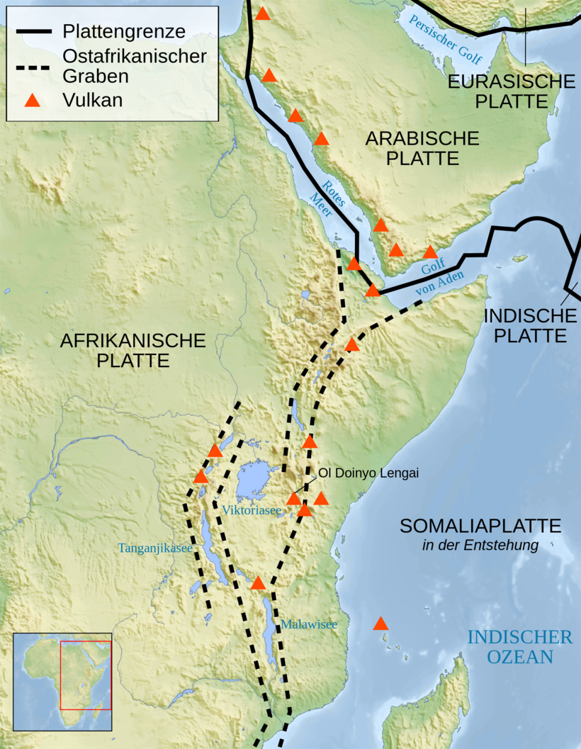 Восточно-Африканская рифтовая долина, или Великая рифтовая долина, протянулась от Красного моря и Аденского залива до Мозамбика на юго-востоке Африки. Разлом делит континент на две неравные части по границам литосферных плит: Африканской (Нубийской) и Сомалийской.