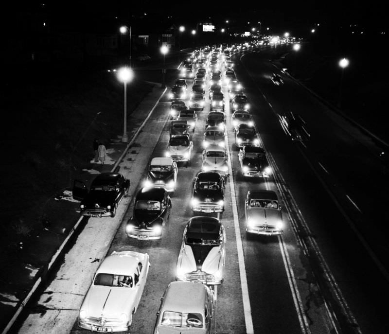 Пробка на 6-й улице в центре Лос-Анджелеса, 1950 г.
