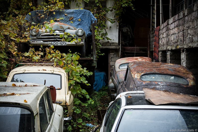 Один из соседей рассказал, что занимается этими автомобилями молодой мальчик, ему всего 40 с чем-то лет (да, для Грузии это еще совсем молодой мальчик), занимается коллекционированием он уже больше десяти лет. Хранятся экспонаты прямо на дороге у дома и на территории за домом, где другие обычно сажают огурцы.