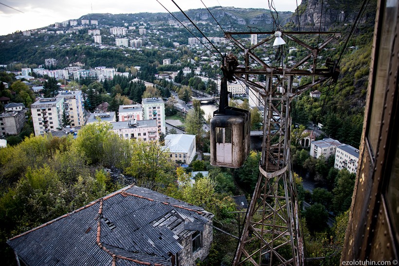 В 19 веке города здесь не было, да и вообще, ничего не было, но в скалах нашли марганцевую руду. Началось строительство рудников и шахт, причем началось в таких масштабах, что уже в начале в 20 века в Грузии добывали больше половины всего марганца в мире! Город был основан в 1921 году. Районы города и шахты оказались разбросанными по разным холмам, и из-за этих особенностей рельефа в 50-е годы начали строить канатные дороги. В этом небольшом городке их оказалось сразу около 20 штук, по ним возили руду, по ним люди добирались из одного района города в другой, на работу и домой с работы. Эти летающие вагончики здесь что-то вроде обычных маршруток. Такого количества канатного городского транспорта не было нигде в мире!