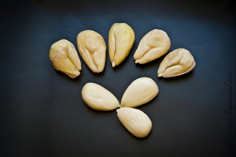 Теперь еще надо очистить тот миндаль, околоплодник которого не очищается руками. Замачиваем на несколько часов, околоплодник набухает и поддается манипуляции: