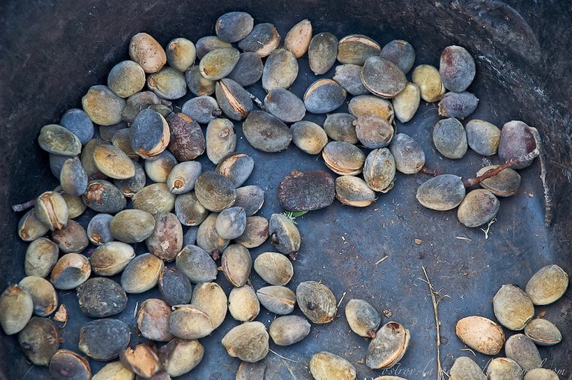 Тот, у которого околоплодник невозможно отделить руками, собирается отдельно. Такого миндаля бывает много, если до сбора урожая были дождливые дни: оболочка набухает, потом на солнце быстро высыхает, и позже ее сложно очистить.