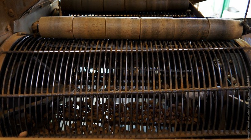 Миндаль загружают сверху в машину и в этом цилиндре орехи раскалываются: