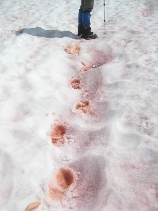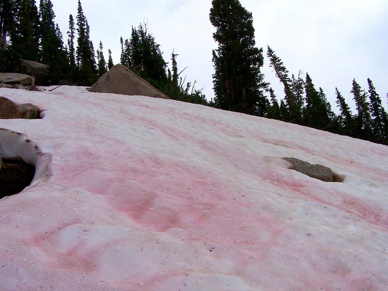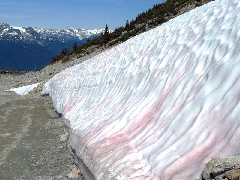 В снежных водорослях содержится красный пигмент астаксантин, именно он отвечает за розовый оттенок. Водоросль развивается на поверхности воды, льда или снега и начинает цвести после холодов: как только снег начинает греться, снежные водоросли розовеют. Но это явление не всегда длится долго: при температуре +4 растения уже гибнут.