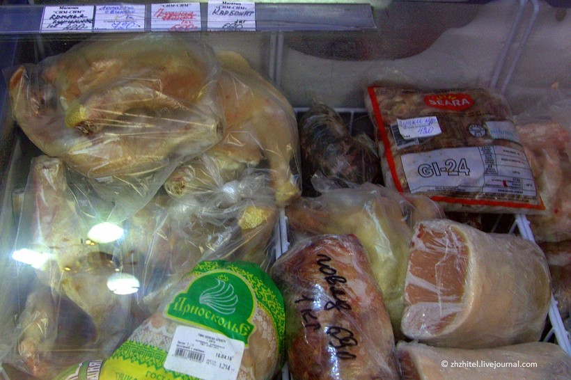 Ценники на мясо. Курятина от 430 рублей за килограмм.
