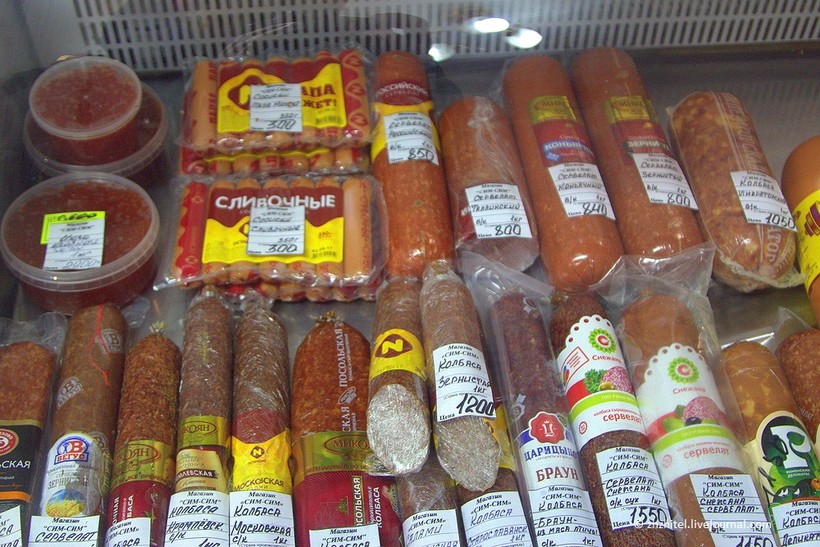 Сосиски 300 рублей за 350-граммовую пачку, колбаса — от 800 до 1550 рублей за килограмм. Красная икра тоже недешевая: 2900 рублей за килограмм.