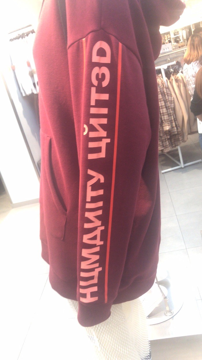Конечно, многие производители указывают на одежде надписи на иностранном языке, но в этом случае мы можем видеть простой набор букв. По крайне мере, так подумает каждый из нас. Однако на самом деле смысл здесь имеется. Оказывается, не только мы любим писать русские слова английским алфавитом, но и китайцы порой пишут выражения русскими буквами. А в данном случае еще и вперемешку с английскими. Так, на кофте изображена надпись: HUMANITY UNITED.