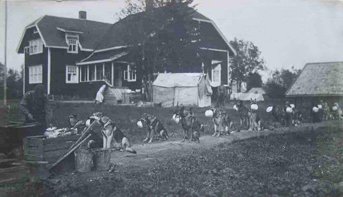 Служебные собаки пограничного патруля ожидают в очереди, чтобы получить обед. Финляндия, 1940-е.