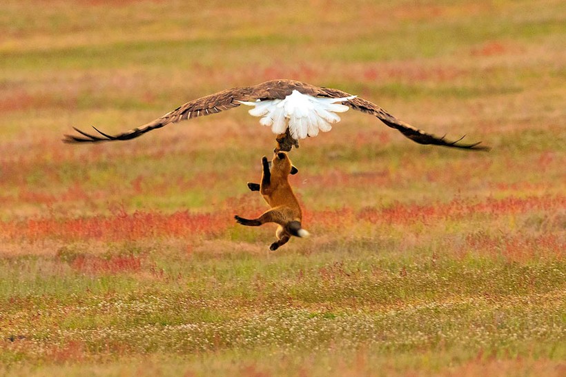 Как рассказал фотограф, воздушное сражение длилось несколько секунд. Наконец, осознав, что победы ей не одержать, лисица отказалась от борьбы, а орел сбросил ее с высоты нескольких метров. Впрочем, животное приземлилось без каких-либо признаков травмы.