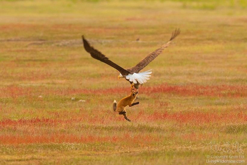 «Пару дней назад я запечатлел особенно драматический акт воровства, — написал фотограф Кевин Эби в своем блоге. — Я видел, как лысый орел украл кролика у молодой рыжей лисицы. Но что еще более впечатляюще, временами битва за добычу разворачивалась на высоте около 5-6 м в воздухе!»