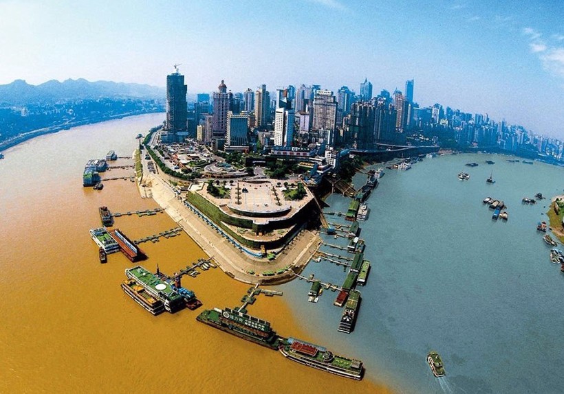 Место впадения реки Цзялин в Янцзы находится в городе Чунцин. Четко видна граница между желто-коричневыми водами Янцзы и рекой Цзялин.
