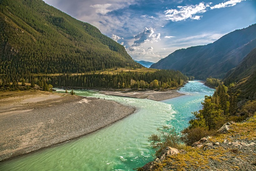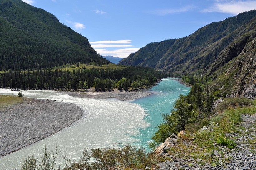 В нашей стране также найдутся места, в которых разные по цвету реки сливаются, образуя живописные картины. Одно из таких — место впадения мутных вод реки Аргут в бирюзовую Катунь.
