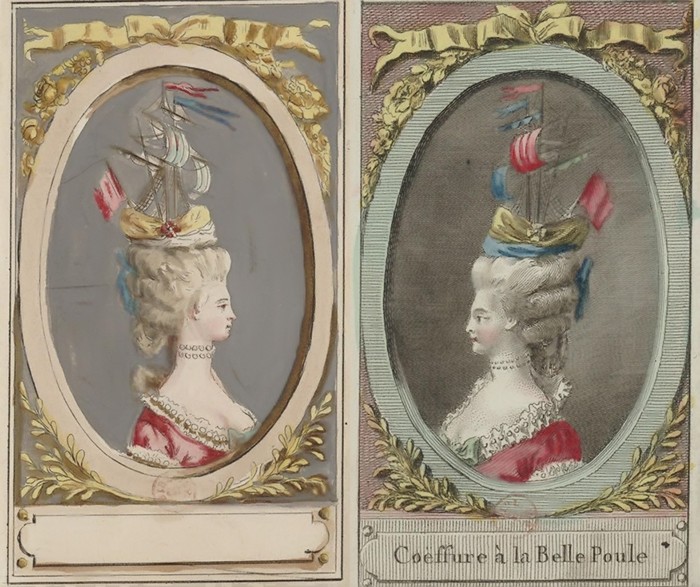 Во второй половине XVIII в моде были невероятные прически, которые можно было сравнить с искусно нарисованной картиной. Мосты, корзины с фруктами (в основном муляжами), крепости и корабли — все это гордо носили на своей миниатюрной головке представительницы прекрасного пола. Чтобы декор не падал, специально для него сооружали конструкцию. К собственным волосам очень часто добавляли конские, а некоторые модницы вообще предпочитали побриться наголо ради париков. Ну что ж, красота требует жертв! И да, для ухода за этой неописуемой красотой была просто необходима специальная тросточка для почесывания, так как в искусных прическах заводились насекомые.