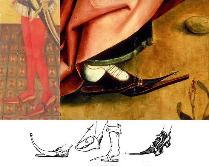 Обувь с длинным носом тоже имеет свою историю. В XIV-XV веках были популярны пулены — длина их носков могла достигать 60 сантиметров! Чтобы нос не терял форму, внутрь подкладывали китовый ус, а особо длинные привязывали к поясу с помощью тесьмы. Существовал и еще один вариант ношения — вторая обувь. Да-да, на пулены надевали что-то наподобие шлепанцев, чтобы было удобнее ходить.