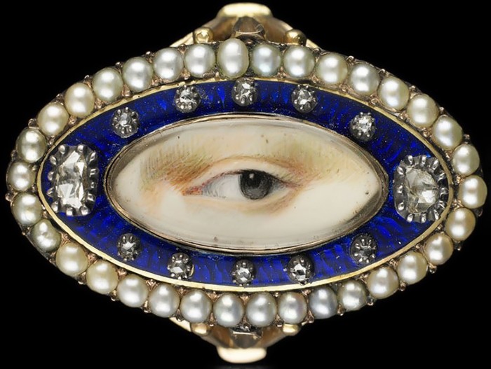 А в XVIII-XIX веке были популярны аксессуары с глазами, к счастью, нарисованными. Глаза возлюбленных заказывали художникам, и полученную картину вставляли в украшения. Медальоны, кольца, броши — отовсюду на мир смотрели человеческие глаза. Так, у королевы Виктории было несколько подобных «портретов», на которых были изображены глаза детей, друзей и близких.