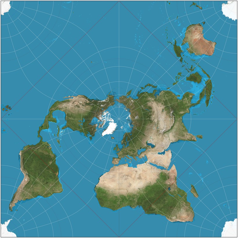 Проекция Димаксион, или проекция Фуллера, представляет собой развертку многогранника и может изображать земной шар в различных вариантах. Проекция создана американским инженером Бакминстером Фуллером в 40-х годах прошлого века. Длина каждой грани этого многоугольника соответствует длине дуги земного шара, а поверхность внутри треугольника сжата относительно реальных размеров.