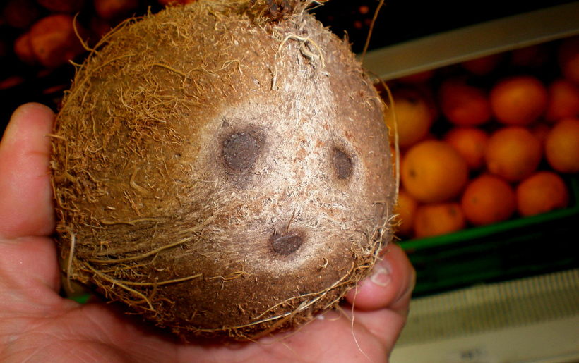 Три темных пятна на поверхности зрелого кокоса — это специальные поры, которые связаны с семяпочками, расположенными внутри ореха. Из трех семяпочек кокосового ореха только одна развивается в полноценное семя и способна дать жизнь новому кокосу.